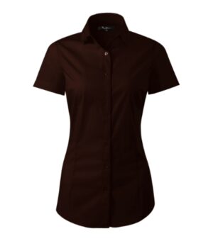 dopasowany krój z bocznymi szwami, podwójny karczek, zaszewki podkreślające damska figurę, kołnierzyk koszulowy, części przednie wykończone plisą, perłowe guziki w kolorze materiału (1 zapasowy), zaokrąglony dół