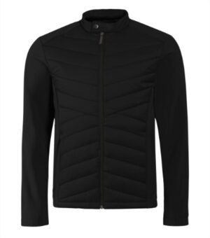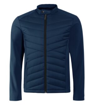 połączenie tkaniny pikowanej i softshellowej, krój z bocznymi częściami, stójka z zatrzaskiem, spiralny zamek błyskawiczny na całej długości , boczne kieszenie z zamkiem błyskawicznym, wewnętrzna kieszonka na suwak, dostęp do brandingu w części tylnej