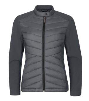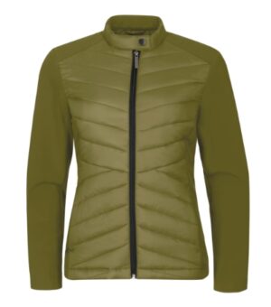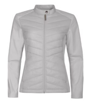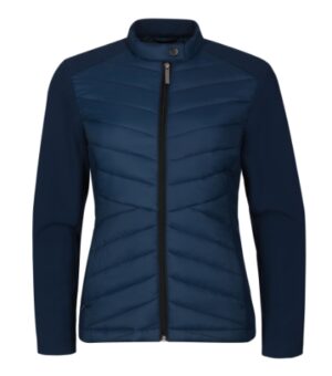połączenie tkaniny pikowanej i softshellowej, krój taliowany za pomocą bocznych części, stójka z zatrzaskiem, spiralny zamek błyskawiczny na całej długości , boczne kieszenie z zamkiem błyskawicznym, wewnętrzna kieszonka na suwak, dostęp do brandingu w części tylnej