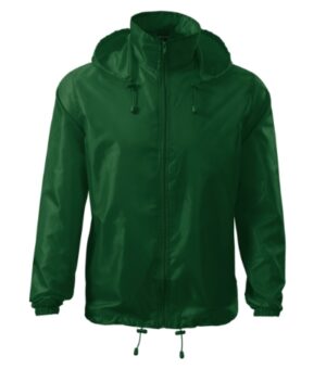 lekki wiatroodporny materiał, spiralny zamek błyskawiczny na całej długości, ukryty kaptur w kołnierzu, regulacja otworu kaptura i jego dolnej części za pomocą elastycznego sznurka, wszyte kieszenie, torebka na suwak umożliwiająca przechowywanie