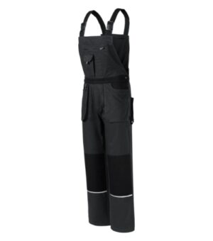 gumka wszyta w pasie z tyłu, zapięcie na guziki w bocznych częściach, regulowane szelki z klamrą i elastyczną wkładką, 8 wielofunkcyjnych kieszeni, wzmocniony materiał na kolanach i tylnej części, plastikowa zawieszka w kształcie litery D i wieszaczek na klucze i identyfikator, pętla na młotek, podwójne szwy dla większej trwałości, elementy refleksyjne