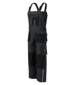 gumka wszyta w pasie z tyłu, zapięcie na guziki w bocznych częściach, regulowane szelki z klamrą i elastyczną wkładką, 14 wielofunkcyjnych kieszeni, wzmocniony materiał w części kolanowej, plastikowa zawieszka w kształcie litery D i wieszaczek na klucze i identyfikator, pętla na młotek, podwójne szwy dla większej trwałości, wysoce odporny materiał CORDURA® w kolorze 01, elementy refleksyjne