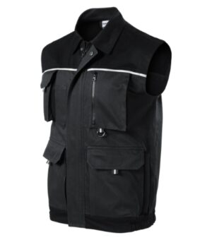 zapinany na całej długości zamek błyskawiczny z klapką, zakładki na plecach, 8 wielofunkcyjnych kieszeni, kieszenie mieszkowe z patką i kieszeniami zapinanymi na zamek, dolna lamówka kamizelki z gumką, metalowa zawieszka w kształcie litery D oraz wieszaczek na klucze i identyfikator, podwójne szwy dla większej trwałości, elementy odblaskowe