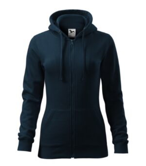 dopasowany krój ze szwami bocznymi, kostkowy zamek błyskawiczny na całej długości, kaptur z podszewką ściągany za pomocą sznurka, wewnętrzna tylna część lamówki wzmocniona kolorową taśmą z materiału wierzchniego, kieszenie naszyte typu kangurka, dolny ściągacz i mankiety rękawów z dzianiny ściągaczowej 2:2 z dodatkiem 5 % elastanu, czesana strona wewnętrzna
